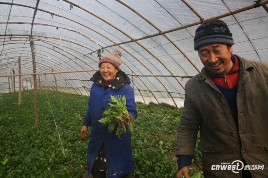 1月28日,安康鎮坪縣板橋村,陳維兵、何登琴夫妻在家門口的蔬菜大棚收菜,看著綠油油的菠菜,夫妻倆心里特開心。(記者 魏永賢)