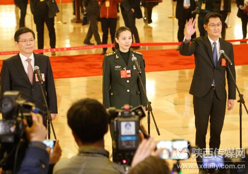 全國人大代表馬化騰(右)、王亞平(中)、徐立毅率先亮相“代表通道”。 任虎鵬攝