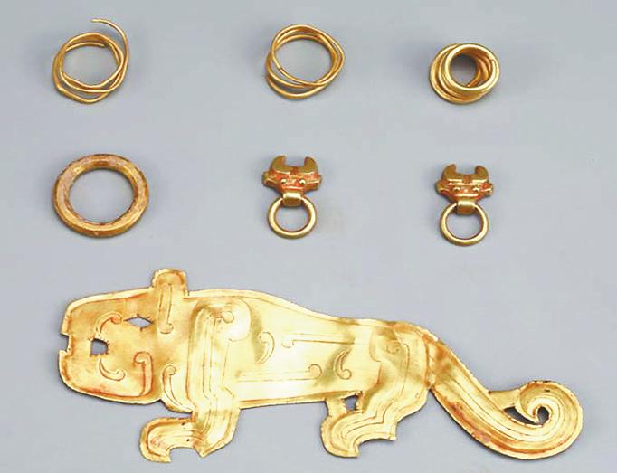 一是鉆探確認了墓地的范圍與墓葬數量,了解了墓葬形制與墓地布局特點。墓地總面積約7700平方米,共發現墓葬56座,車馬坑2座,馬坑1座。特別引人注目的是兩座“中”字形大墓(編號M1與M2),東西并列分布,居于墓地中部偏東處。二是對墓地進行全面發掘,2017年共發掘墓葬20座,出土了銅、金、鐵、石、玉等材質的器物。墓葬多使用木質棺槨葬具,墓主人頭向多朝北,仰身直肢。根據墓葬及隨葬品特征判斷,其年代為春秋早期或略偏晚階段。三是通過周邊區域系統調查,找到了與墓地年代相匹配的兩處居址遺存,包括有陶窯、灰坑、板瓦堆積及陶器殘片,以及一處由夯土和壕溝組合成的面積10余萬平方米的核心區域。根據采集陶器與板瓦的特征判斷,兩處居址的年代為春秋早中期前后。