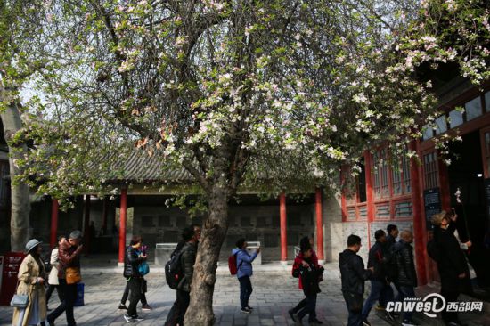 3月21日,游人穿過花海,進入展室看如林碑石。這個季節,庭院深深的碑林博物館處處是花,春意盎然。