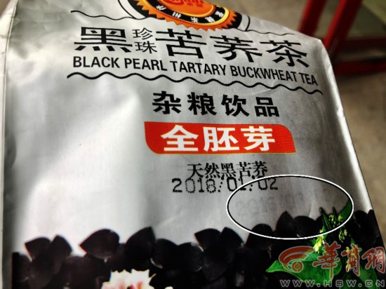 4月7日中午1點多,賀先生和友人一起在西影路華潤萬家超市閑逛時,購買了一些苦蕎茶,但賀先生卻發現了這些苦蕎茶包裝袋子上的異樣。