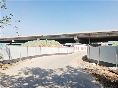 順著這條小路繼續向南,穿過鋼材廠后,能看到高速橋的南側臨時圍擋背后,一塊面積巨大的空地上堆滿了建筑渣土和垃圾,已經形成了很大規模,而且渣土堆的高度已遠遠超過了一人多高的圍擋,最高的部分甚至快要和高速橋底齊平了。渣土上面只有一部分覆蓋了防塵網,其他部分裸露在外。由于長期無人清理,防塵網已經和渣土融為一體,周圍的角落里還能看到附近居民傾倒生活垃圾的痕跡。