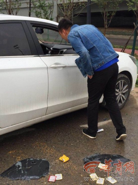 上午12時許,華商報記者在征和六路與天臺路十字東北角一小區的臨街商鋪前,看到4輛車玻璃被砸的車輛停放在路邊。其中3輛車1塊車玻璃被砸,而另1輛3塊車玻璃被砸的車主,剛剛到現場,他找到了民警現場勘查后留下的紙條。該車主說:“哎,咋這么倒霉,除了駕駛位、其余3塊側玻璃全被砸空,座位都是玻璃碴,車里翻得亂七八糟。”