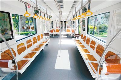 機(jī)場(chǎng)線車輛美觀大方,飽滿圓潤(rùn)的大流線型車體給人以速度感和沖擊力,簡(jiǎn)單的“松石藍(lán)”腰線貫穿整個(gè)純白車身,內(nèi)部車輛座椅暖色的蜂窩狀花紋使車輛更具層次感。