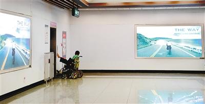 他將電動輪椅開到無障礙設施處,用腳按下求助按鈕。