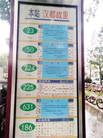 王女士說,她家住在漢城北路漢都故里小區,門前有6條公交線,她在土門上班,每天乘坐23路和631路就可直達單位附近,十分方便。可是,8月20日下班回到小區門口的公交車站時,發現有224路、50路、23路、631路公交站牌上貼著一張告示稱: 8月23日起,這4條公交線路取消漢都故里便民站。“漢城北路沿線除了漢都故里小區外,還有雅卓花園、簡約花園和風尚馨筑等多個居民小區,涉及的居民比較多,一下子取消了4條公交線,將會給多少人的出行帶來不便?”王女士說,8月23日早上,她在小區門口公交車站準備乘坐公交車去上班時,發現只剩下225路和186路,另外4趟公交車均不見蹤影。她朝南步行了10分鐘左右來到城西客運站時,發現這4條線路的起點站原來被挪移到了此處。