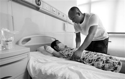 張明龍在醫院照顧孩子 記者 代澤均攝