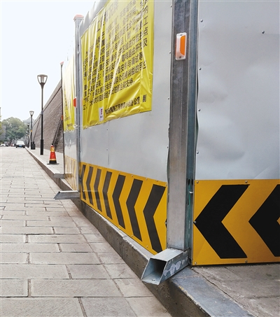 朱雀門東側順城巷內一處圍擋基座鋼管向馬路伸出
