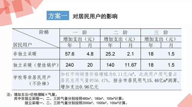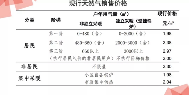 二是獨立采暖(壁掛鍋爐)居民用戶。按照調整后的居民用氣一階銷售價格,一階年最高氣量為2000立方米計算,每戶年增加支出240元,月增加支出20元;二階最高氣量1000立方米氣量計算,每戶年增加支出140元,月增加支出11.67元,對用氣量達到三階年最高氣量3000立方米以上的用戶,氣價增幅0.18元每立方米,用氣100立方米,增加支出18元。