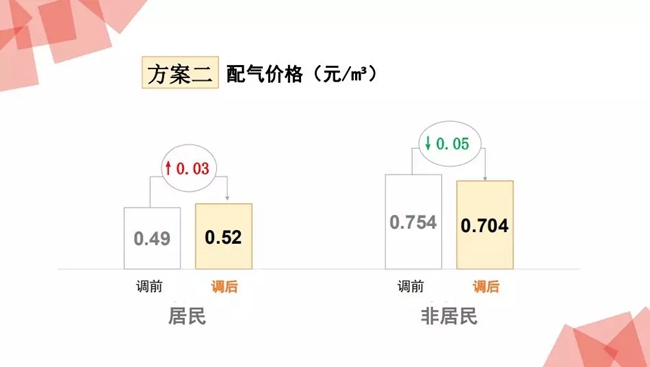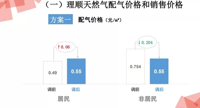 1、以“條件不具備的城市盡量縮小差價”為目標,以重新核定的配氣價格0.55元美立方米為基準,居民配氣價格由現行的0.49元每立方米調整為0.52元每立方米,上調0.03元每立方米,非居民配氣價格由現行的0.754元每立方米調整為0.704每立方米,,下調0.05元每立方米。