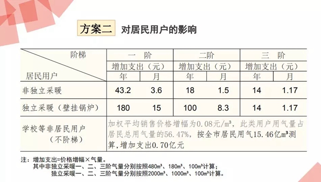 一是非獨立采暖用戶,按照調整后的居民用氣一階銷售價格,一階年最高氣量為480立方米計算,每戶年增加支出43.2元,月增加支出3.6元;二階最高氣量180立方米氣量計算,每戶年增加支出18元,月增加支出1.5元,對用氣量達到三階年最高氣量660立方米以上的用戶,氣價增幅0.14元每立方米,用氣100立方米,增加支出14元。