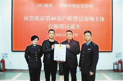西安市工商局雁塔分局向新登記的第46萬(wàn)戶市場(chǎng)主體頒發(fā)營(yíng)業(yè)執(zhí)照