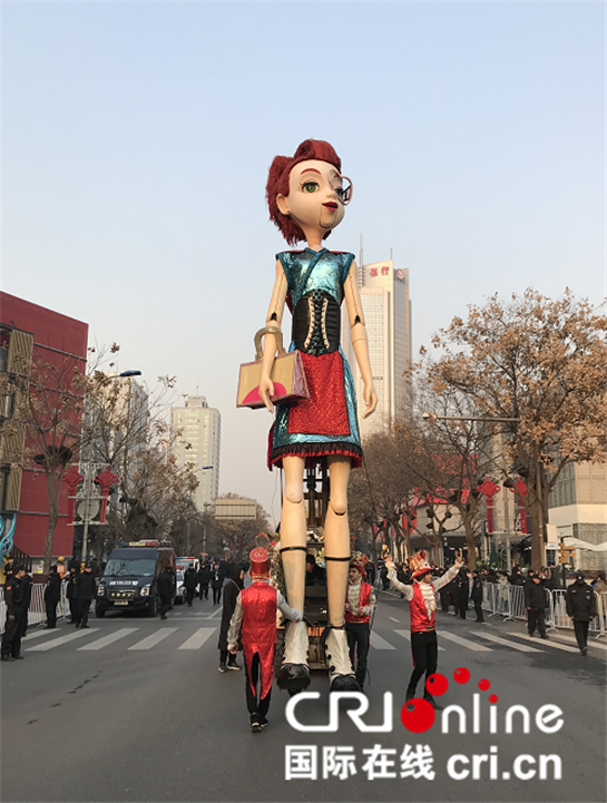 西安高新區跨年活動中花車巡游現場的巨人木偶蘿拉(攝影 陳嵐)