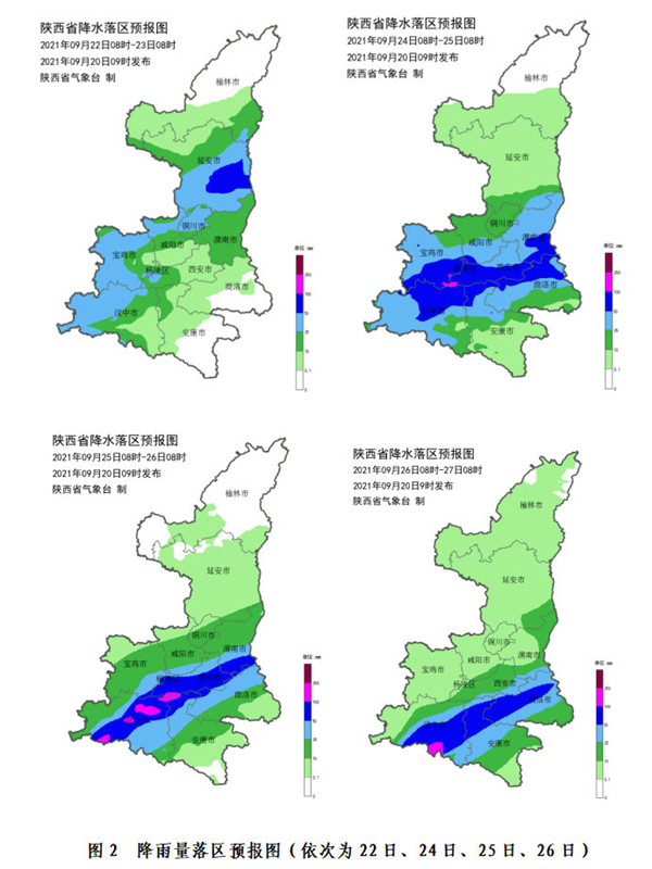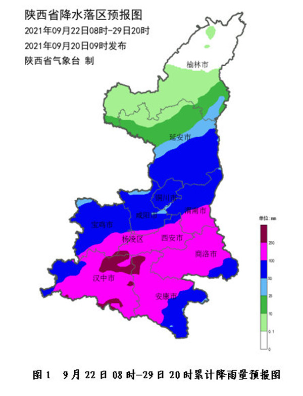 受副高外圍暖濕氣流和高空槽共同影響,22日白天起我省將開始新一輪持續性陰雨天氣,預計將維持至月底。過程期間有3個以上暴雨日,其中22日強降水主要位于陜北南部、關中西部、陜南西部,以大到暴雨為主;24-26日強降水主要位于關中、陜南地區,部分地區有暴雨,不排除局地出現大暴雨的可能性;27日至月底強降水主要位于陜南地區。過程累計降水量:陜北中北部5~40毫米;延安南部、關中北部60~80毫米,局地可達100毫米以上;關中南部、陜南大部100~200毫米,局地可達200~300毫米(圖1)。降水前期間具有對流性質,預計局地最大小時雨強20~40毫米。