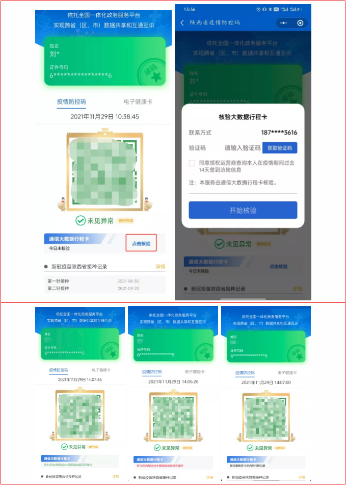 居民可在微信或支付寶中打開陜西健康碼小程序的“我的防控碼”界面,就能看到在防控碼下方專有一欄“通信大數(shù)據(jù)行程卡”,“點擊核驗”即可根據(jù)陜西疫情防控碼所綁定手機號查詢最近14天是否到過中高風險地區(qū)。并且疫情防控碼頁面上僅保留當日的核驗結(jié)果,如第二天使用需要再次點擊核驗。