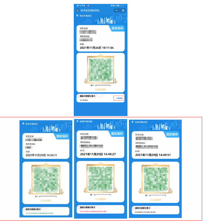 升級后的陜西省疫情防控碼與通信大數(shù)據(jù)行程卡(即行程卡)實現(xiàn)“卡碼融合”,無需跳轉(zhuǎn),同一界面即可實現(xiàn)疫情防控碼、行程卡、疫苗接種等信息的顯示。
