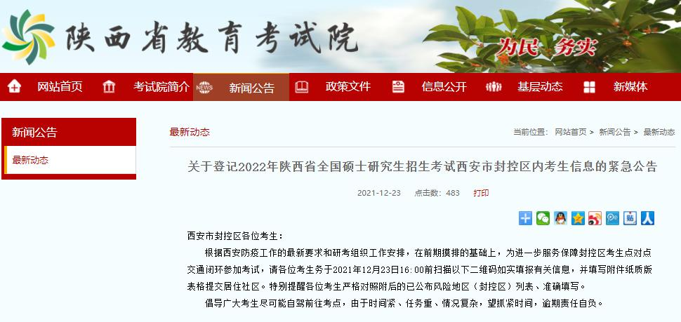 12月23日,陜西省教育考試院發布緊急公告稱,各位考生務于今日(23日)16:00前如實填報有關信息,并填寫附件紙質版表格提交居住社區。具體內容如下:
