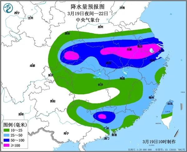 預計,3月20日08時至21日08時,四川盆地東北部、陜西東南部、湖北、河南南部、安徽中南部、江蘇南部、上海、浙江北部等地有大雨,其中,重慶北部、陜西東南部、湖北北部和東部、河南東南部、安徽中部和西南部、江蘇南部、上海、浙江北部等地部分地區有暴雨,局地有大暴雨(100~120毫米),上述部分地區伴有短時強降水(最大小時降雨量20~40毫米,局地可超過50毫米),局地有雷暴大風或冰雹等強對流天氣。