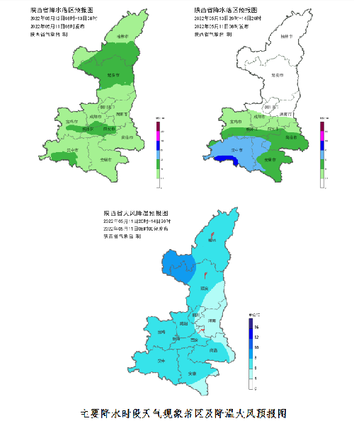 過程降水量陜北、關中北部5~30毫米,關中南部、陜南20~40毫米,陜南南部局地可達40~70毫米。過程期間部分地方伴有雷暴,小時雨強最大可達10~20毫米。過程日平均氣溫自北向南下降6~8℃,13日凌晨陜北北部局地最低氣溫可降至0℃左右,陜北西部局地最低氣溫可降至2℃左右。