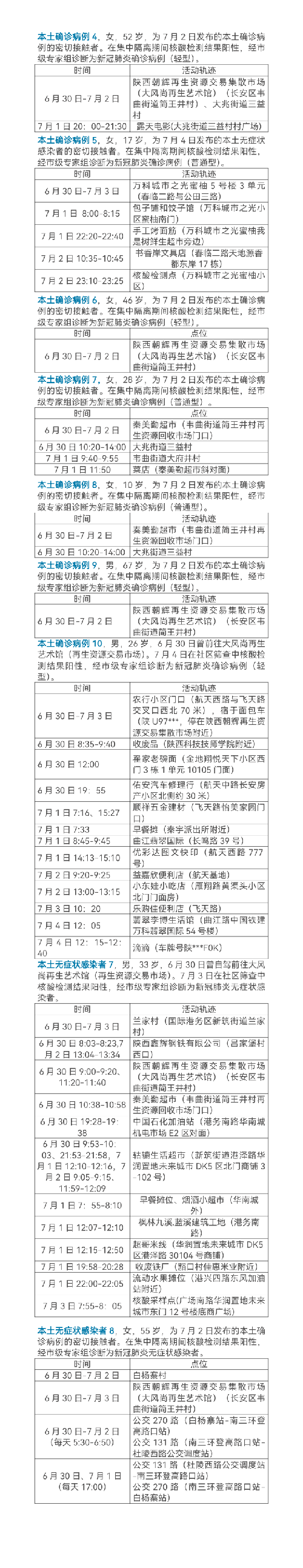 7月4日0-24時,西安市新增7例本土確診病例,2例本土無癥狀感染者,7例在集中隔離中發現,2例在社區篩查中發現。主要活動軌跡如下:ftP安康新聞網