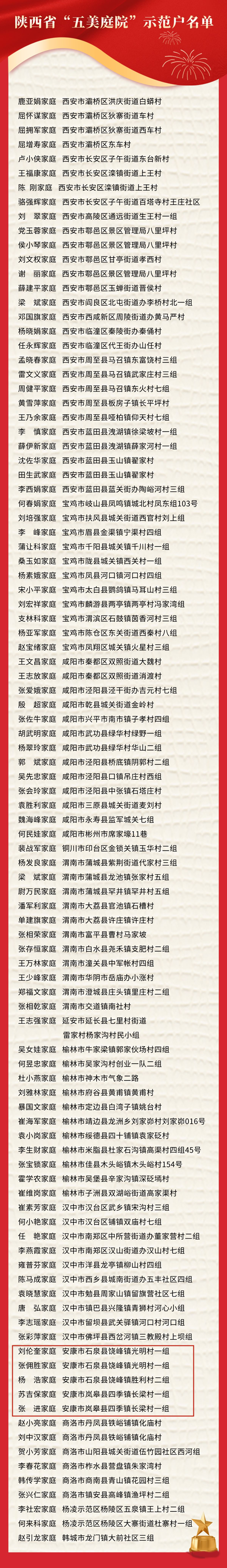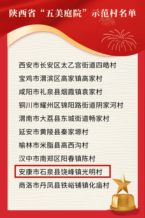 近年來,全省各級婦聯(lián)堅持以習(xí)近平新時代中國特色社會主義思想為指導(dǎo),貫徹落實全面推進鄉(xiāng)村振興的決策部署,深入推進“鄉(xiāng)村振興巾幗行動”,以“五美庭院”創(chuàng)建工作為抓手,在參與生態(tài)文明建設(shè)、助力脫貧攻堅、推動鄉(xiāng)村振興中發(fā)揮了積極作用,農(nóng)村人居環(huán)境、鄉(xiāng)風文明程度顯著提高。為進一步發(fā)揮典型的示范引領(lǐng)作用,省婦聯(lián)首批認定西安市長安區(qū)太乙宮街道四皓村等10個村為陜西省“五美庭院”示范村,鹿亞娟家庭等100戶為陜西省“五美庭院”示范戶,現(xiàn)將名單予以公布。