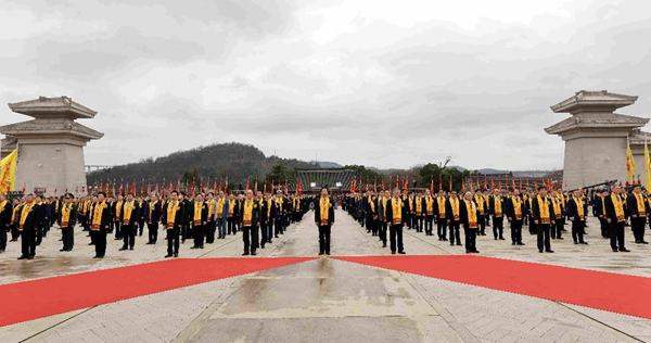 清明的橋山,古柏蒼蒼,沮水泱泱。典前序禮上,序禮執事宣誦祝文,來自全國部分省、自治區、直轄市,香港、澳門特別行政區和臺灣地區以及海外的與祭嘉賓,在儀仗隊的引領下,至誠至虔,景行軒轅橋、龍尾道,至軒轅廟山門。隨后,各方代表在指定區域列隊肅立。橋山祭祀廣場上,象征中華民族大團結的56面龍旗迎風飄揚,現場氣氛莊嚴、肅穆。