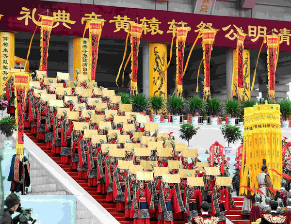 鼓聲雄渾,鐘鳴悠遠。擊響的34通鼓聲,象征著全國34個省、自治區、直轄市,香港、澳門特別行政區和臺灣地區,以及海內外中華兒女崇敬初祖的共同心聲;9響鐘鳴,代表了中華民族傳統禮儀的最高禮數,表達全體炎黃子孫對人文初祖軒轅黃帝的無限景仰和無比感恩。《黃帝頌》響徹全場,拉開典禮大幕。