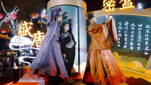 “《西游記》中九九八十一難,第一難是什么?”“不知道,不要緊,來,拍個照。”夜色漸濃,西安市大雁塔下的大唐不夜城華燈熠熠,流光溢彩。兩位身著古裝的演員,分別扮演唐代名人房玄齡和杜如晦,出題與游客進行互動,幽默風趣的提問和回答引得臺下觀眾不時發出陣陣歡笑。