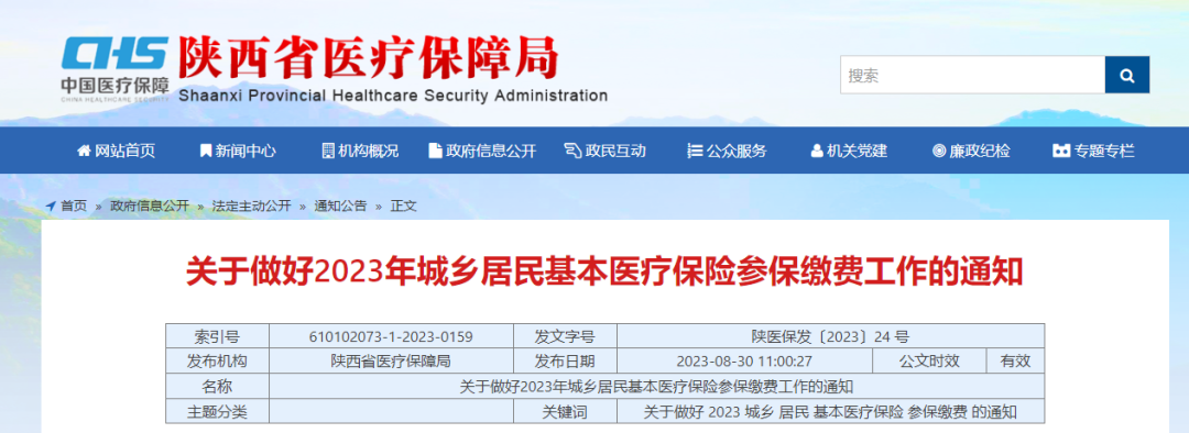 8月30日,陜西省醫(yī)療保障局網(wǎng)站發(fā)布了關(guān)于做好2023年城鄉(xiāng)居民基本醫(yī)療保險(xiǎn)參保繳費(fèi)工作的通知。