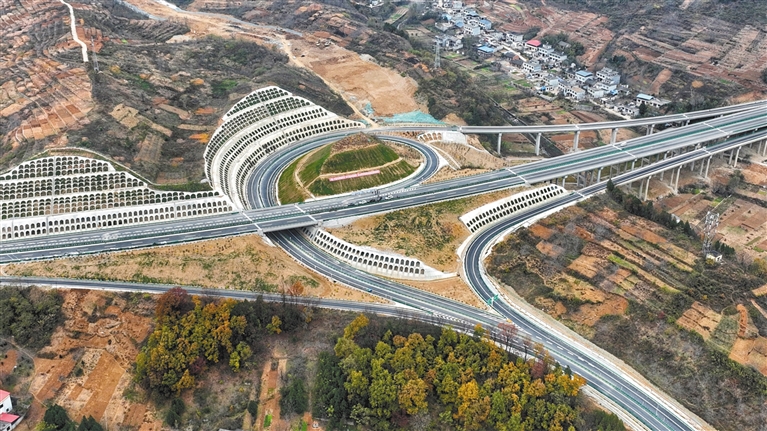 航拍的丹(鳳)寧(陜)高速公路竹林關樞紐立交(資料照片)。 記者 許奧博攝