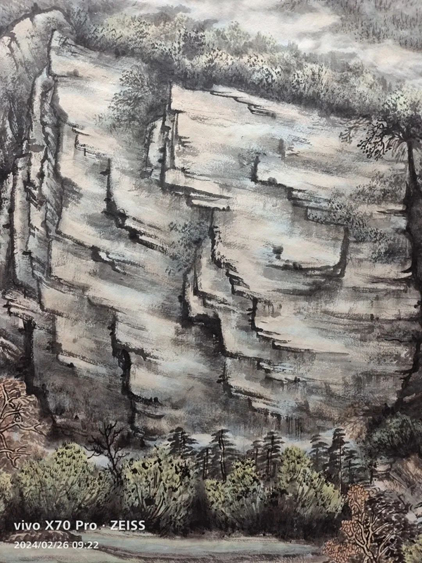 著名畫家靳尚誼先生曾強調美術的實踐性,只有扎實地實踐才有真功,才有高度。我覺得,要畫溪山這樣一座名山,范寬在過去已經畫得夠大了, 若在現今要表現它的宏偉氣派,必須以一個現代人的視野去展現,求得良好的視覺沖擊。因此,我決定以我畫室的現有條件,最大畫一幅丈二尺幅的溪山。
