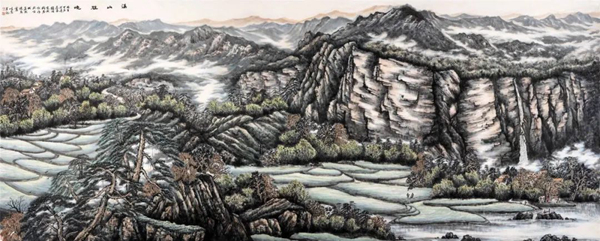 基于這樣的思考,一幅溪山作品的構圖在腦海漸漸形成,它將是一幅以綠色為基調的青山綠水圖畫,是人與自然和諧共生的美麗情愫。全畫由近、中、遠三部分構成,以平視和仰視的角度分別體現。近景畫出幾塊巨大嶙峋的山石,配以年輪久遠的古松和新植的翠松。背后是暮春的梯田、村落,小河邊有洗衣的婦女和在田間勞作的人們。這些符號結合在一起,所要表現的就是時空久遠與現實的延伸,人與自然依然和諧共生共榮,增加現代生活氣息;中景突出巨碑式的丹霞層巖,巖上飛流而下的飛瀑,表現溪山的巍峨與壯觀,這是全畫中必須用心刻畫的細節。溪山的厚重、峻峭,都要通過有力的線條表現出來,增強溪山的氣勢和偉岸,但又要注意不能給人以壓抑感,要以云遮霧掩顯現它的神奇和神秘;遠景是大山背后的遠山層巒,分三層漸次疊加。最上一層是春暉映照的暖色遠山,對整個的冷色基調形成對比和映襯,使畫面不至于過于沉郁。總之,我要表現的是春色之中磅礴而壯麗的溪山。