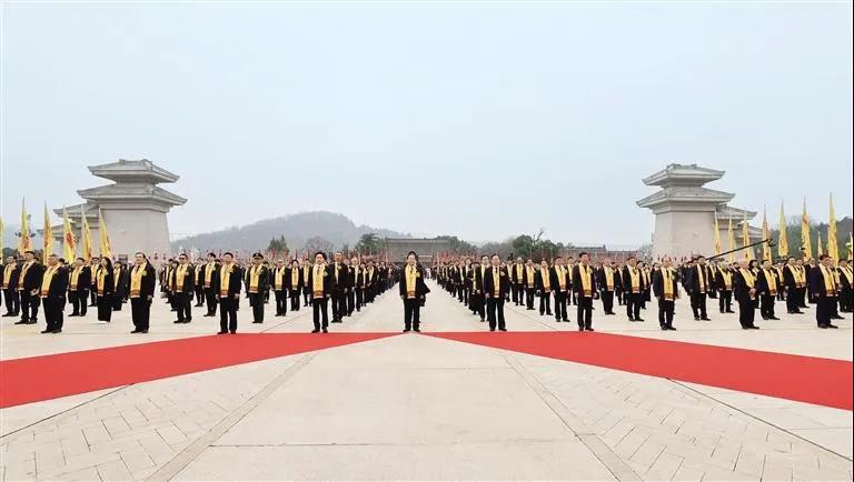 橋山巍峨,沮水流長。典前序禮上,序禮執事宣誦《典前祝文》,來自全國部分省、自治區、直轄市,香港、澳門特別行政區和臺灣地區以及海外的參祭嘉賓,在儀仗隊的引領下,至誠至虔,一路景行軒轅橋、龍尾道,進軒轅廟山門。軒轅廣場上,象征中華民族大團結的56面龍旗迎風飄揚,參加公祭大典的各方代表在指定區域列隊肅立,現場氣氛莊嚴、肅穆。