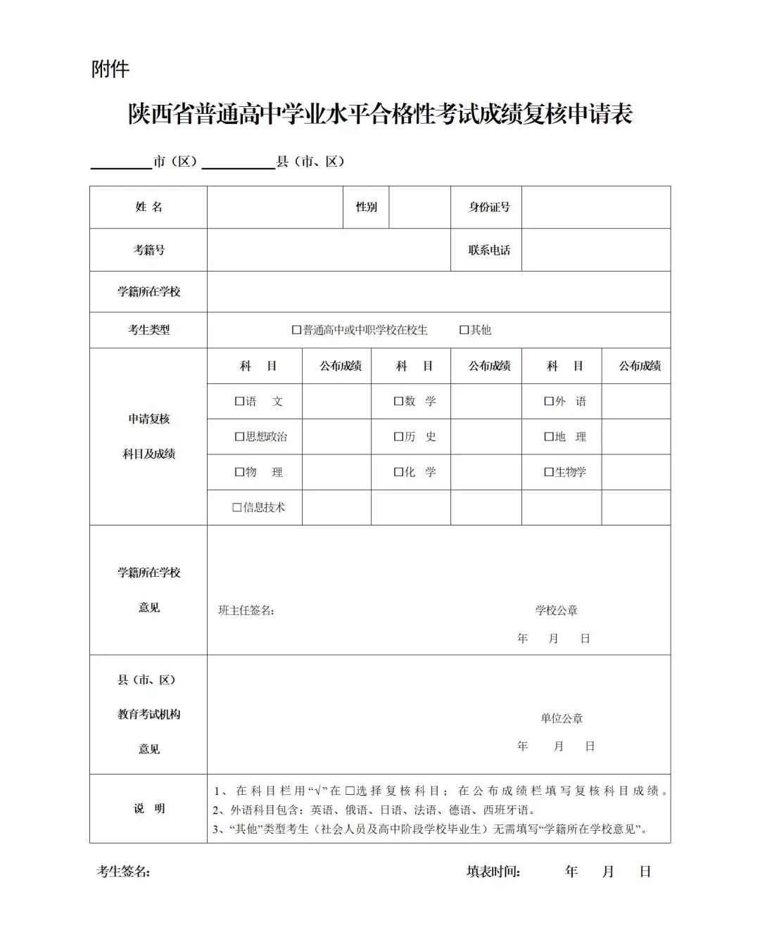 附件:陜西省普通高中學業水平合格性考試成績復核申請表