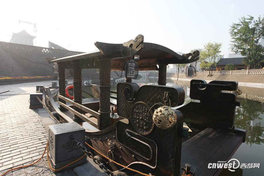 這艘黑色的仿古船長度五六米,船身上有瓦當裝飾圖案。