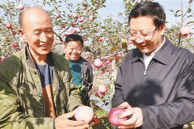 薛占海(右)在寶塔區棗園街道辦廟溝村幫果農朱懷明算蘋果銷售賬。 本報記者 龔仕建攝 一見到陜西金風科技有限公司負責人李超,延安市長薛占海就急切地問:“你……
