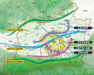 大西安產業結構規劃圖 高新區創業咖啡街區 秦嶺風光 浐灞美景 建設中的西安奧林匹克體育中心 市民參觀西安市規劃館 灃東自貿產業園 古城墻和護城河 鐘……