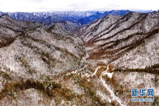 11月5日無人機拍攝的陜西省漢中市佛坪縣涼風埡景區雪景。 當日,秦嶺初雪,色彩斑斕的秋色在白雪映襯下,美如畫卷,置身其間,恍若進入童話世界。 新華社記者陶……