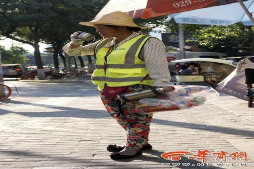 7月22日下午5時許,西安市南二環中段,一名保潔員戴著草帽在喝水,她手中還拎著撿到的飲料空瓶。 記者 趙彬 攝 因為在檢查中發現保潔路面煙頭較多,一名保潔員……