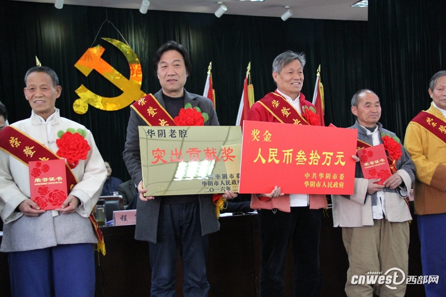 華陰市為“華陰老腔”頒發突出貢獻獎,為老腔藝人們頒發了榮譽證書。西部網訊(通訊員 楊雷雷 孟晟博) “華陰老腔”榮登2016年中央電視臺春節聯歡晚……