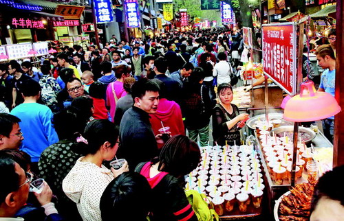 清明小長假,名揚海內(nèi)外的西安市北院門小吃一條街上,灌湯包子、柿子餅、羊肉泡饃、水盆羊肉、鏡糕、烤全羊等上百個品種的特色小吃吸引了世界各地數(shù)以萬計的游客……