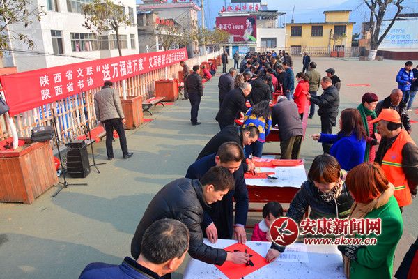 安康新聞網訊(通訊員 吳磊 郎海俠)1月23日,由陜西省文聯、陜西省書協組織的“送萬福進萬家”義寫春聯公益活動在縣體育場舉行,省書協副主席史星文、吳福春、劉偉群等數十位省、市書法家參加義寫活動。縣委常委、宣傳部長魯延福出席活動并致辭。