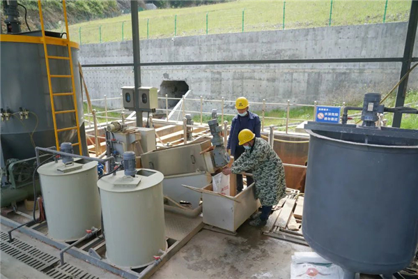 ↑4月9日,工作人員在白河縣里端溝(二期)重金屬污染綜合整治工程項目污水處理站內(nèi)清淤。