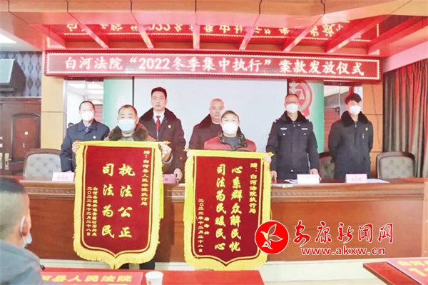 發放儀式上,通報了白河法院2022年冬季集中執行行動開展情況,對國家司法救助條件和程序進行了詳細解讀, 32名申請執行人領取了案款發款牌,發放儀式井然有序進行。據悉,自2022年11月1日“冬季集中執行行動”開展以來,白河法院共執結執行案件474件,執行到位金額9672.8萬元,共宣布拘留12人,將69人納入失信被執行人名單,向78人發出限制消費令。該院集中執結涉民生案件142件,執行到位金額153.2萬元,同時積極爭取資金,為困難申請人落實司法救助資金48.01萬元。