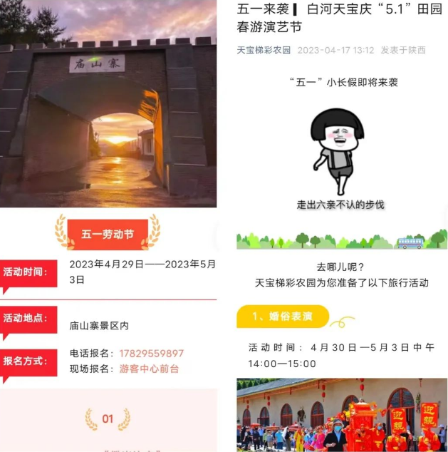 景區景點開放到位。“五一”期間,3家A級景區景點全部正常開放。其中天寶4A景區從4月29日至5月3日籌備舉辦田園春游演藝節系列活動,推出門票七折優惠措施;廟山寨3A景區將舉辦“廟山”好聲音、攀巖比賽等節慶活動,推出138元游玩通票打五折、門票+餐飲立減等優惠措施。