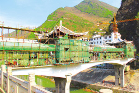 12月12日,工人們正在加緊建設景觀廊橋。據了解,白河縣白石河景觀廊橋工程于去年11月開工建設,總投資500萬元,橋長90米,寬7.5米。 吳 磊 攝……