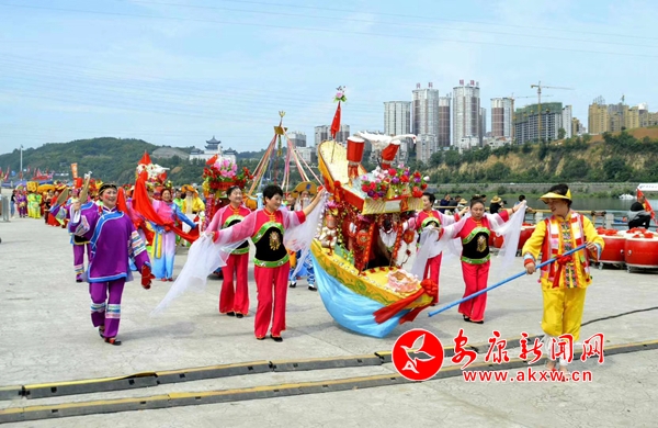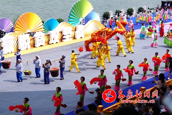 在龍頭祭祀儀式、龍舟競(jìng)技展示、“非遺”展演及民族歌舞表演等主題活動(dòng)之后,來自漢濱區(qū)的民間文藝社團(tuán)驚艷登場(chǎng),深受大眾喜愛的火龍、舞獅、彩龍等民俗節(jié)目伴隨著隊(duì)員們孔武有力的舞動(dòng)跳躍博得現(xiàn)場(chǎng)陣陣歡呼;喜慶熱烈的采船、花轎表演,俏皮滑稽的大頭娃娃、濟(jì)公,栩栩如生的西游記人物展演以及酒缸、花連棍、戲曲人物、民族舞展演等讓現(xiàn)場(chǎng)觀眾目不暇接,文藝隊(duì)員們?cè)谡寡葜写蠓女惒剩c(diǎn)燃了現(xiàn)場(chǎng)觀眾的激情。