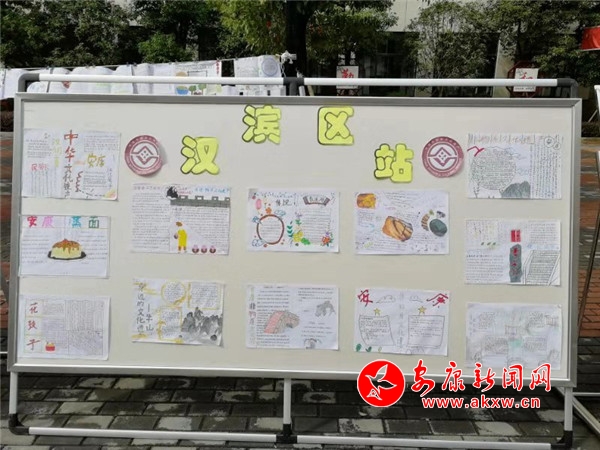 此次展板按地域文化特色,分為漢濱區站、旬陽平利站、漢陰石泉站、鎮坪站、紫嵐寧站五大板塊。每一張手抄報,從設計到排版,從書寫到繪畫,都各具特色:這里面有對壯美河山的贊美,有對雄偉建筑的欽佩,有對安康區縣奇觀異景、民俗文化的自豪……圖文并茂的手抄報吸引了全校師生駐足觀賞,嘖嘖稱贊,更有學生拿著紙筆認真地做記錄。