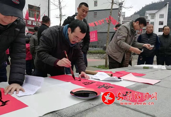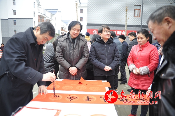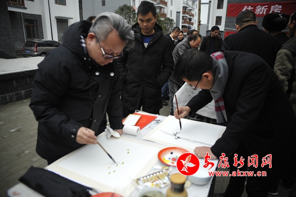 座談結束后,郭線廬一行在該鎮社區廣場開展了春聯義寫活動。現場創作書畫作品免費贈予群眾,來自省、市、區的書畫家們飽含激情,現場揮毫潑墨,把一個個“福”字、一副副對聯、一張張精心創作的書畫作品送到群眾的手中,受到了周邊群眾的歡迎。