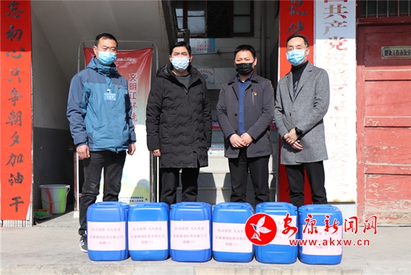 2月4日下午兩點,早陽鎮(zhèn)機關(guān)院內(nèi)開來了一輛車,下車的人一邊打開后備箱一邊自我介紹道:“我姓陳,老家是咱們吉慶村的,我在外面開醫(yī)藥公司,現(xiàn)在消殺物資很短缺,我也是盡自己所能,給鎮(zhèn)上帶來一些酒精和消毒液。”